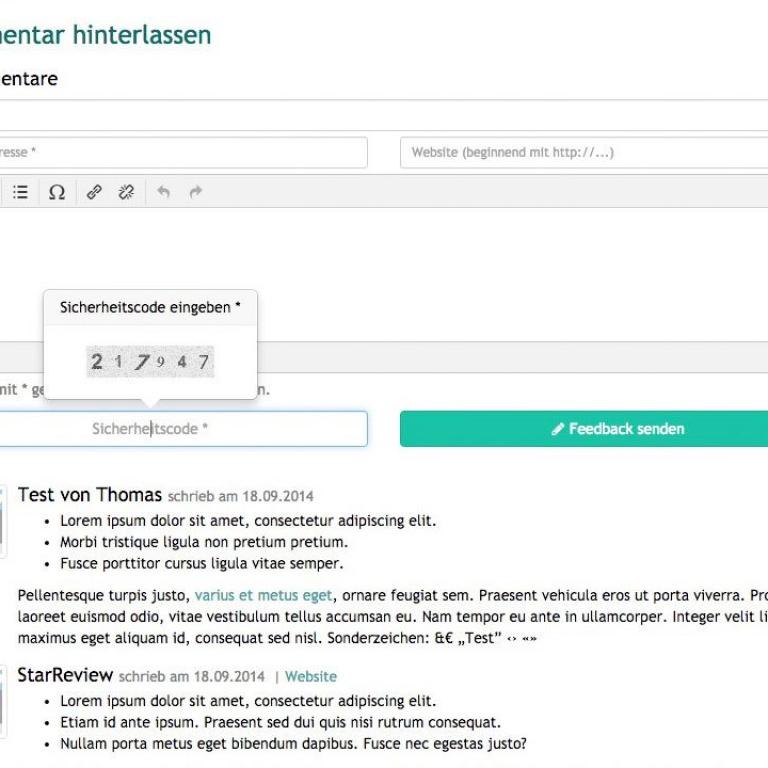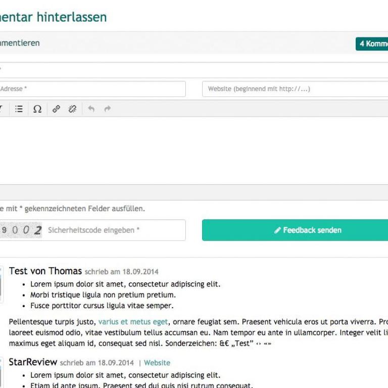 Das Feedback Formular ist ideal um Ihren Besuchern die Möglichkeit zu geben öffentlich einen Kommentar auf Ihrer Webseite abzugeben. Gegenüber dem Standardplugin sind weitere Funktionen wie Gravatars und eine automatische Benachrichtung per E-Mail integriert. Zusätzlich ist es für mobile Endgeräte angepasst, so dass auch Besucher per Smartphone oder Tablets komfortabel Kommentare zu Ihrer Seite oder dem Produkt abgeben können. Nutzen Sie das Feedback-Plugin um Ihre Siquando Shop oder Web 9 Webseite zu einem Blog werden zu lassen, mit allen Funktionen die dazu gehören.