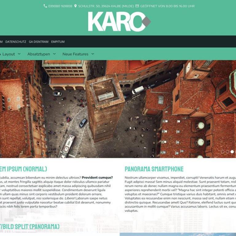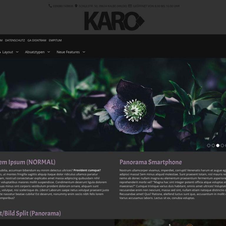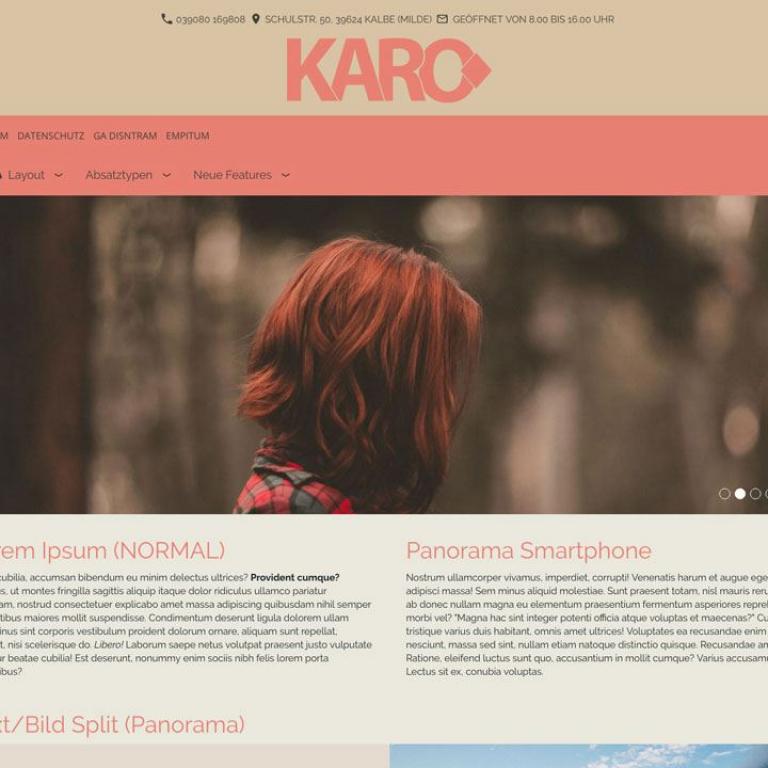 Das neueste Layout von KARO ist ein responsives Flex-Layout für Siquando Pro Web 3 mit zusätzlichen Einstellungsmöglichkeiten innerhalb der Klienten-Vorschau. Sie können nun die vertikale Reihenfolge der Bereiche verändern, Overlay- oder Parallaxbilder bestimmen, „nach Oben“ - Scroll - Buttons konfigurieren und natürlich auch wieder Google Font Schriftarten angeben.