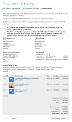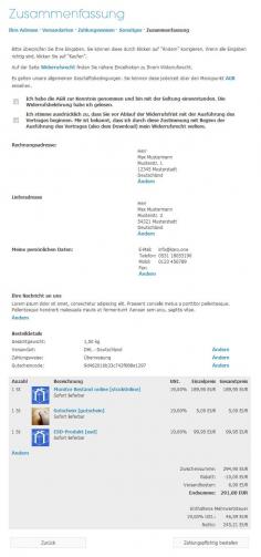 Zusätzlich wird die Zusammenfassungsseite und somit auch die E-Mail die Ihr Kunde und wahrscheinlich auch Sie als Auftragsbestätigung erhalten neu formatiert. Die Lieferadresse erscheint nun neben der Rechnungsadresse. Eine versehentliches Übersehen der Lieferadresse sollte somit Geschichte sein. Außerdem werden auch die Bestelldetails nun rechts neben den persönlichen Daten bzw. Benutzerdaten dargestellt. Dies ist nicht nur übersichtlicher sondern spart auf Dauer auch eine Menge Papier.