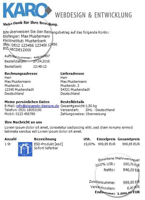 Vielleicht sind Sie einer der Siquando Shop 8 Anwender die in letzter Zeit gehäuft den Netto-Betrag, statt des Gesamtbetrages, überwiesen bekommen? Auch dieses Problem ist mit dieser überarbeiteten Version behoben, denn nun steht der Gesamtbetrag an letzter Stelle und nicht der Nettowert.