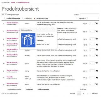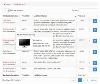 Die Produktübersicht (inkl. Suche) für Siquando Shop oder Shop to Date stellt serverseitig alle Produkte eines Shops innerhalb einer übersichtlichen Tabelle dar. Ihre Kunden können bequem eine bestimmte Anzahl von Produkten in den Warenkorb legen, ohne die Produktseite direkt besuchen zu müssen. Enthält das Produkt Varianten werden diese auch (innerhalb des "Tooltips ) ausgegeben, zusätzlich wird bei Produkten mit Onlinebestandsverwaltung die Anzahl der im Lager vorhandenen Produkte angezeigt und jede Spalte kann sortiert werden.